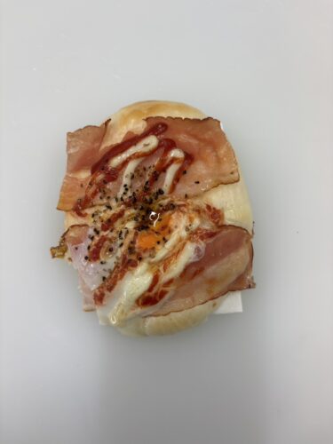 『はなたまご』を使用したベーコンエッグをそのままパンにのせちゃいました。