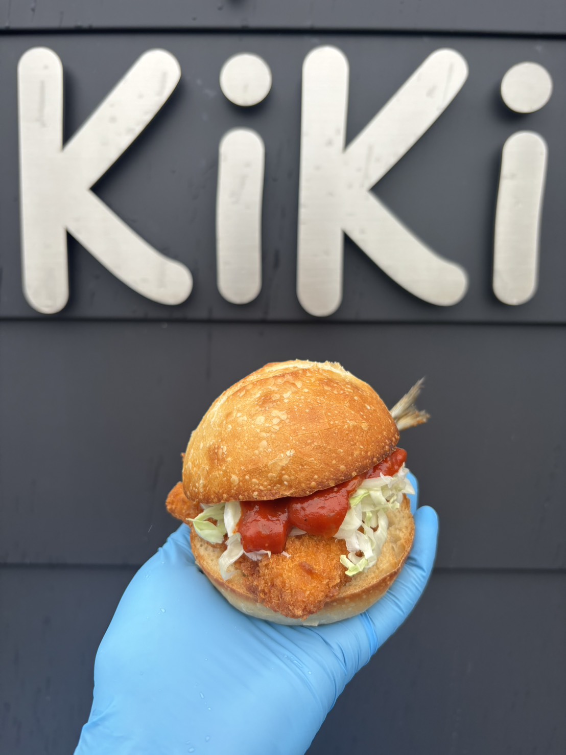 1尾まるまる使ったアジフライに愛菜館のキャベツ、チリメキシカンソースをのせ、フランスパン生地で挟みました。