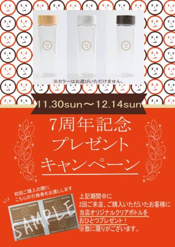 以前告知させていただいた通り、11月30日(日)~12月14日(日)の期間中、2回ご来店・商品をご購入いただいたお客様にオリジナルクリアボトルをおひとつプレゼントいたします。 ※カラーはお選びいただけません。