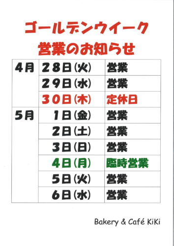 いつもBakery&Café KiKiをご利用頂き、誠にありがとうございます。